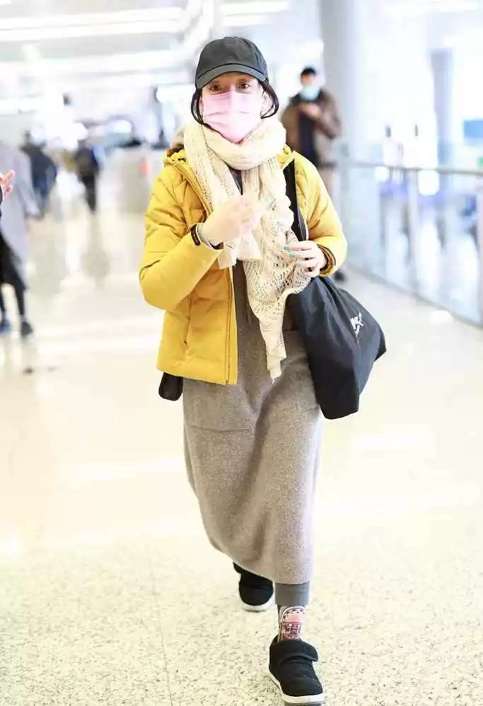 个子不高的周迅,更爱穿短款棉服。如果换成长款,容易显胖显矮。这身黄色短棉服配灰色针织裙,看着随意,却把周迅的温柔可爱劲儿全穿出来了。