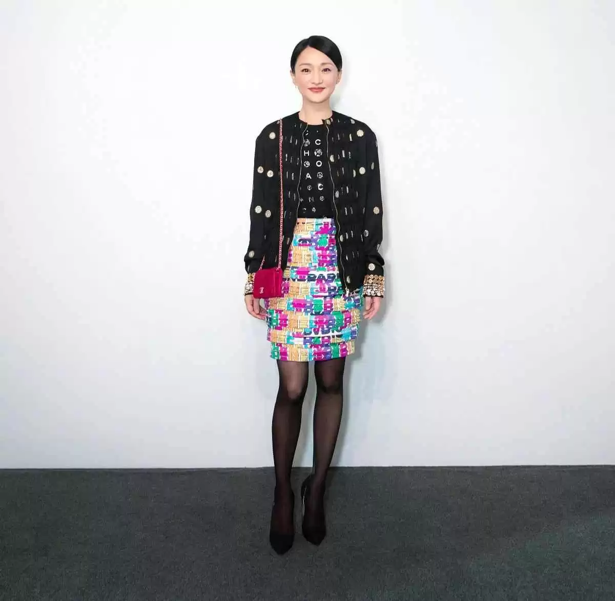 出席活动时,周迅的造型也很亮眼。比如这身黑色波点小外套配彩色高腰短裙,视觉冲击力强,显得优雅又端庄。